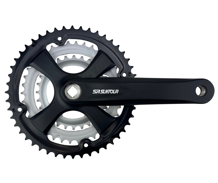 Suntour XCC-T208 négyszögtengelyes hajtóműFogszám kiosztás: 28-38-48THajtókar hossz: 170 mmAnyaga: Alumínium hajtókar + acél lánctányérSzín: fekete hajtókarok + fekete (48T) és szürke (28-38T) lánctányérok