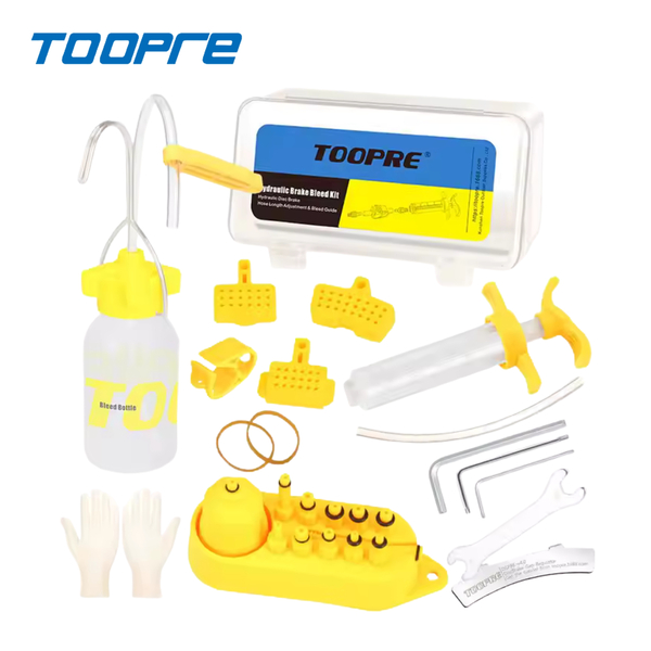 Toopre univerzális tárcsafék légtelenítő készlet réz csatlakozókkalTartós réz csatlakozóinak köszönhetően műhelyek számára is ideálisSzéleskörű kompatibilitás: Shimano, Sram, MaguraKészlet tartalma: Fecskendő, 10 cm gumicső, csőszorító, gumicső rögzítő, réz csatlakozók, tölcsérdugó, tölcsér, szerelvénytartó, fékdugattyú távtartók (3 méret), légtelenítő tartály akasztóval, 2/3/5mm imbuszkulcs, T10-T15 Torx kulcs, tárcsafék pozícionáló, 7/8 villáskulcs, befőttesgumi, gumikesztyű, tartódoboz Anyaga: műanyag + rézSzín: sárga
